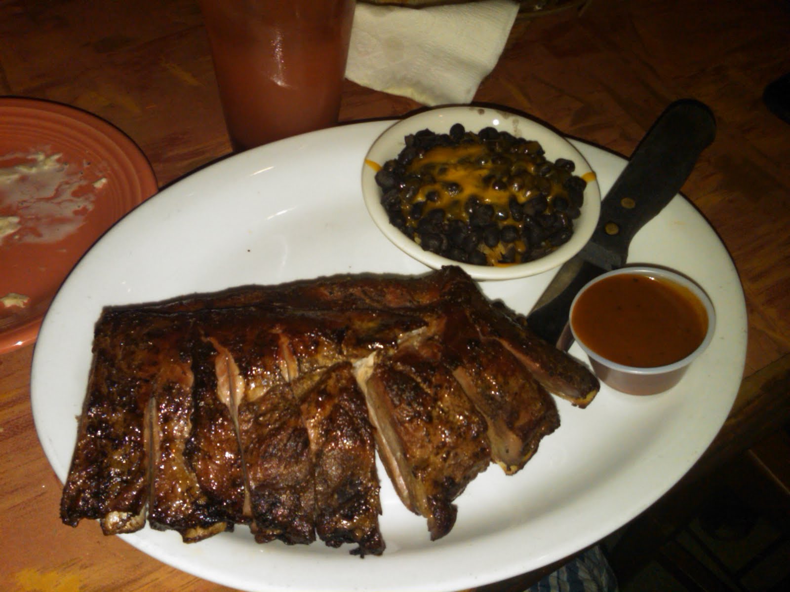 Then for food, I asked the waitress if the ribs were serious business or if I should order a whole slab. She said I’d be crazy to order a whole slab for myself unless I planed to take a bunch home with me. I didn’t. So I got a half slab, with a side of Black Beans and Rice with cheese on top. D.Rough got the pulled BBQ pork and some sweet potato casserole (we’re from Minnesota – we are required by law to order things when they say casserole or hot dish).